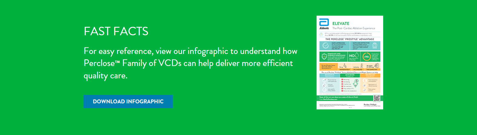 **As observed in the PROFA trial (80% discharged within 3:34h) and the PRO-PVI trial (≥3:38 hours post-procedural time to discharge) after successful close with Perclose device(s) in patients who have undergone cardiac arrhythmia treatments with multiple common femoral venous access sites.