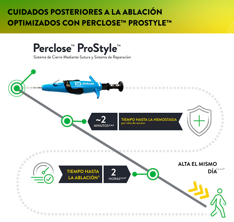** Según lo observado en los ensayos PROFA (80 % de los pacientes dados de alta dentro de 3:34 h) y PRO-PVI (≥ 3:38 horas post procedimiento hasta el alta) tras el cierre exitoso con dispositivo(s) Perclose™ en pacientes que se sometieron a tratamientos de arritmias cardíacas con múltiples accesos venosos femorales comunes.