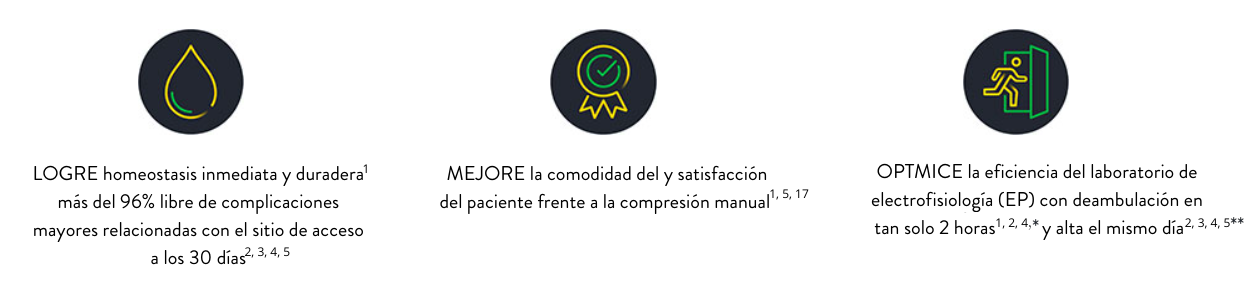 - Tiempo hasta la hemostasia (TTH) promedio de ~2 minutos por acceso²˒⁴˒⁵
