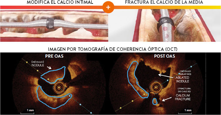 Un único dispositivo reduce el calcio de la intima y fractura el calcio de la media. El lijado diferencial y las fuerzas pulsátiles permiten la modificación simultánea tanto del calcio de la intima y de la media para la entrega, expansión y aposición óptimas del stent en lesiones severamente calcificadas1-4