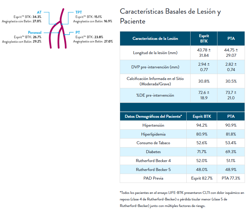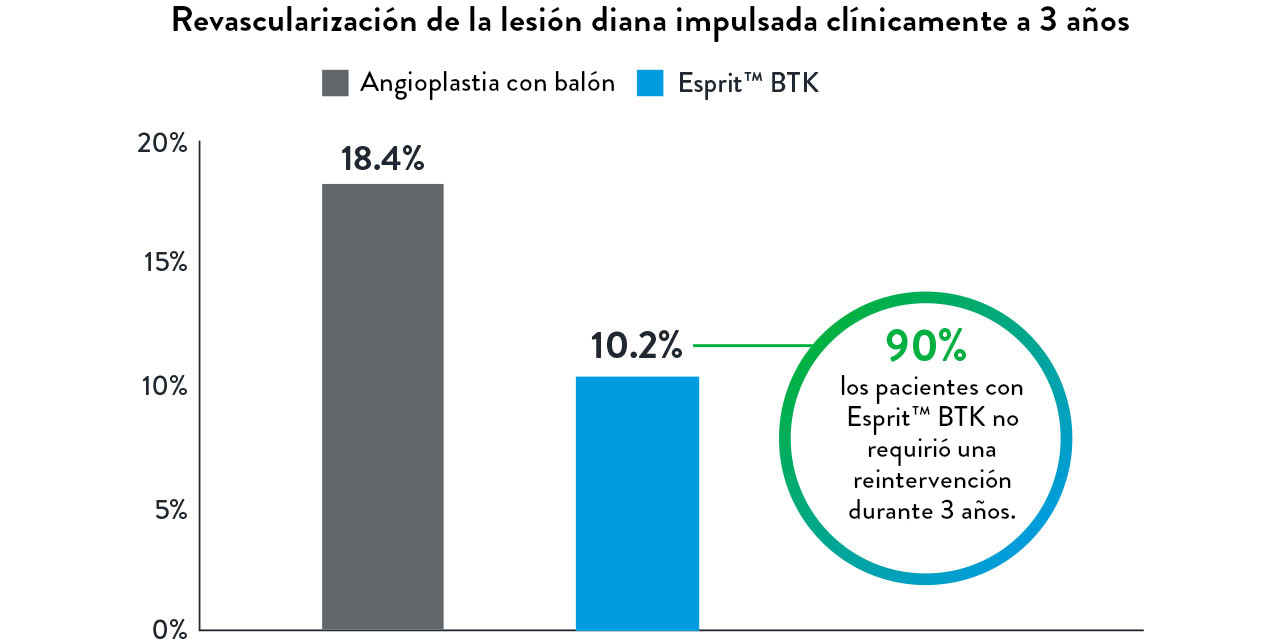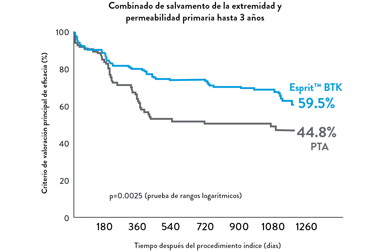 | Esprit™ BTK ofrece beneficios continuos a largo plazo frente a PTA, en particular en términos de preservación de la extremidad y permeabilidad primaria hasta los 3 años. Una clara ventaja frente a PTA en cuanto a permeabilidad vascular sostenida y preservación de la extremidad.1 | ![]() |