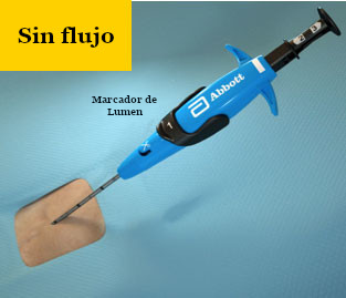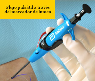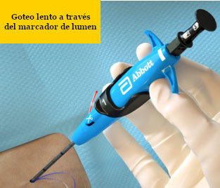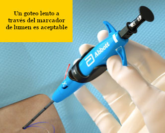 Para preparar el dispositivo, verificar la permeabilidad del marcador de lumen irrigando solución salina hasta que esta fluya por el puerto del marcador. |