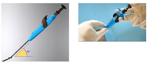 A. Cargar el extremo azul (guía) de la sutura en el empujador de nudos con sonda (o en el cortador de suturas) y avance el nudo de sutura |