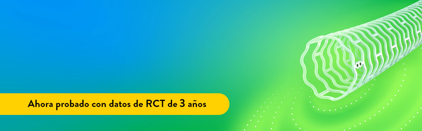 - Proporciona soporte de andamiaje para abordar el retroceso del vaso y la disección,2 con una fuerza radial similar a la de un stent metálico durante los primeros 6 meses.3